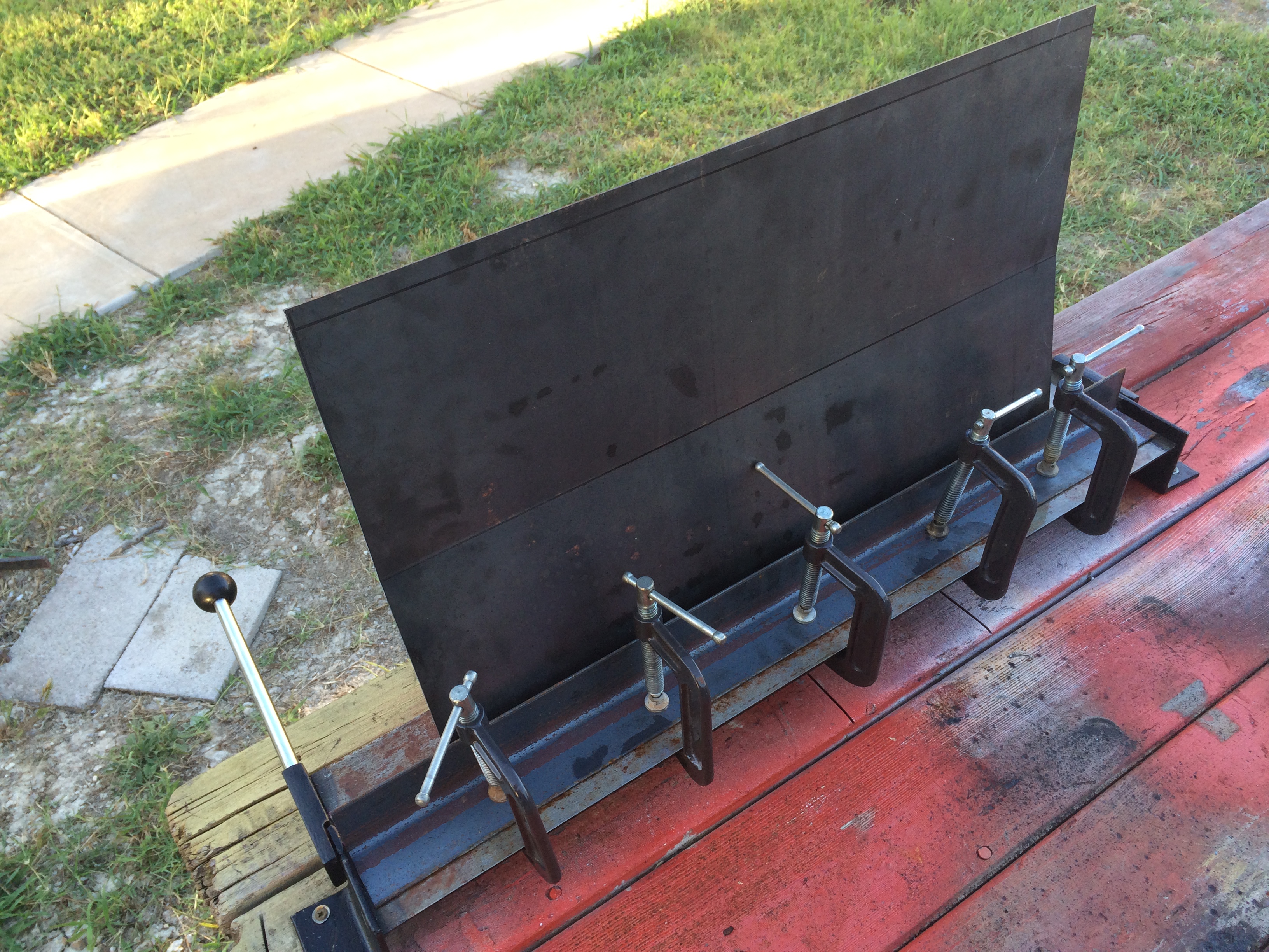 current | 22:41, 13 September 2015 | ![]() | 3,264 × 2,448 (2.79 MB) | Dnevil (talk | contribs) | I used a low-cost sheet metal brake from Harbor Freight to bend all the roof sections. Here is the long roof section after begin cut in two parts. This is the longest section and the hardest to bend in this jig. I used all the C-clamps I could round... |