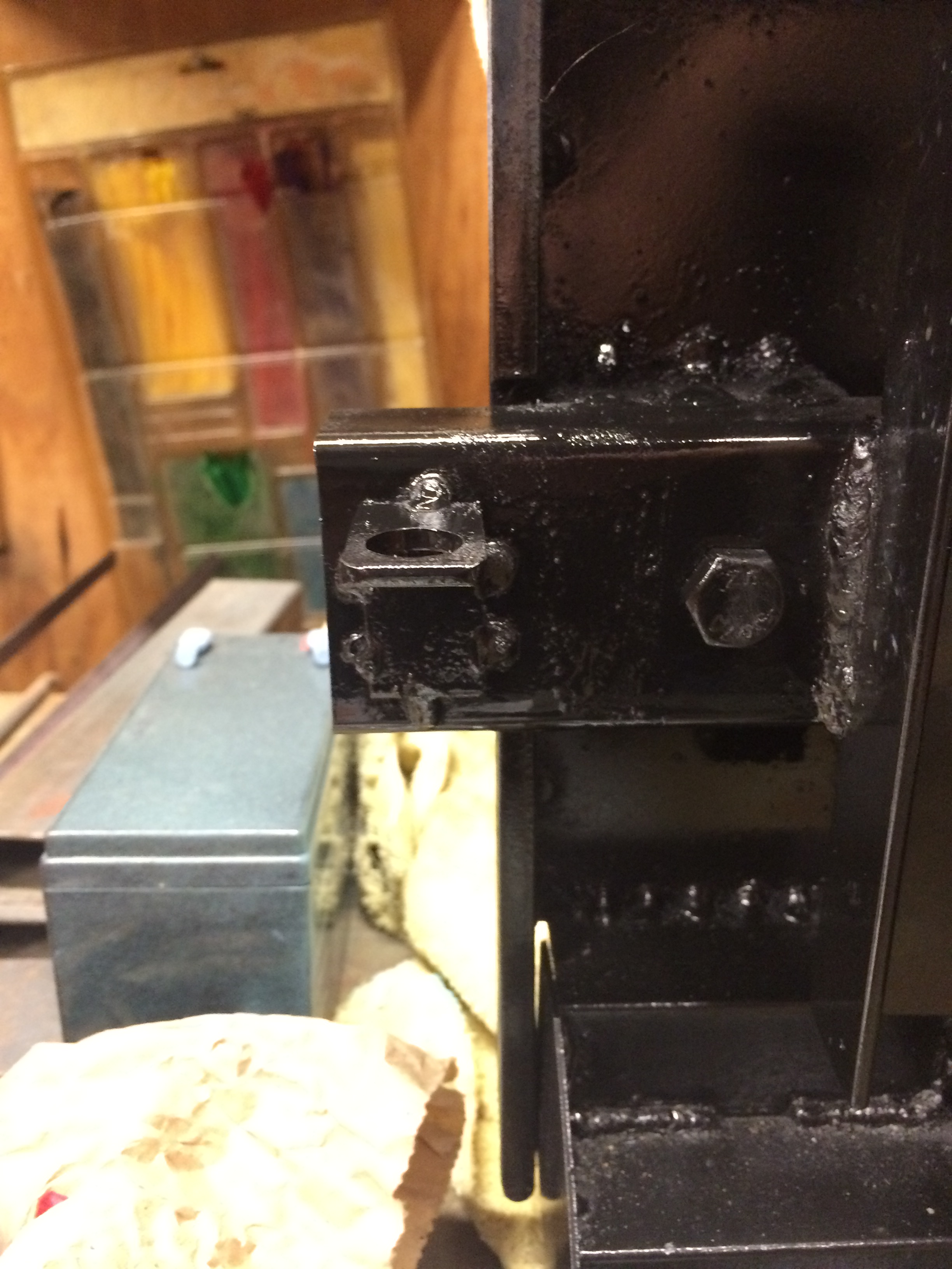 Two brackets are fashioned from 2 by 2 inch angle steel and welded under each coupler pocket. These brackets hold the Clippard switches to the train line. Photo by Daris A Nevil, August 2015.