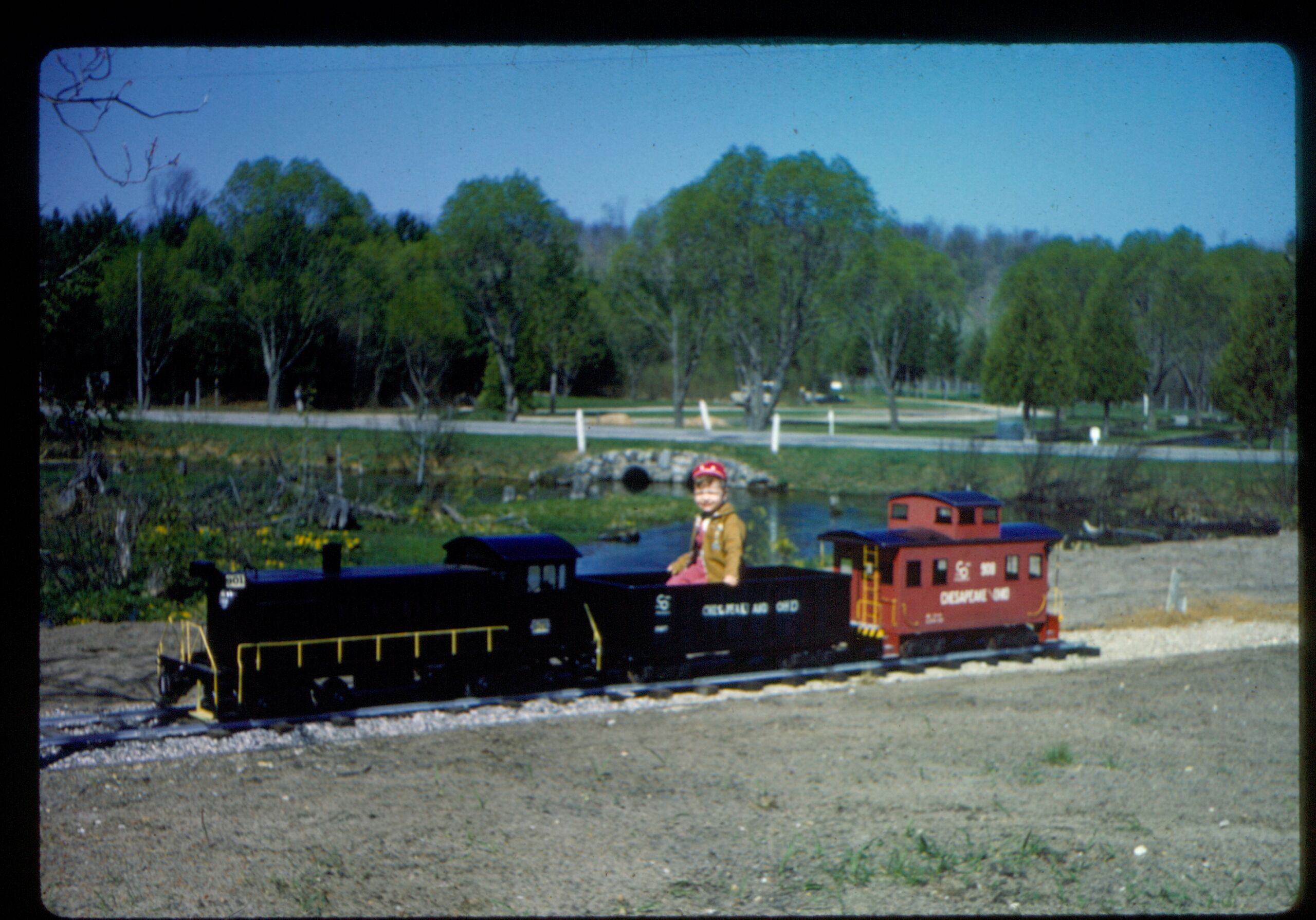 The Atkinson Railroad in Chesapeake and Ohio livery, 1962, with 2-year-old John D. Atkinson at the throttle. From http://www.pbase.com/visual_first/image/148982641/original