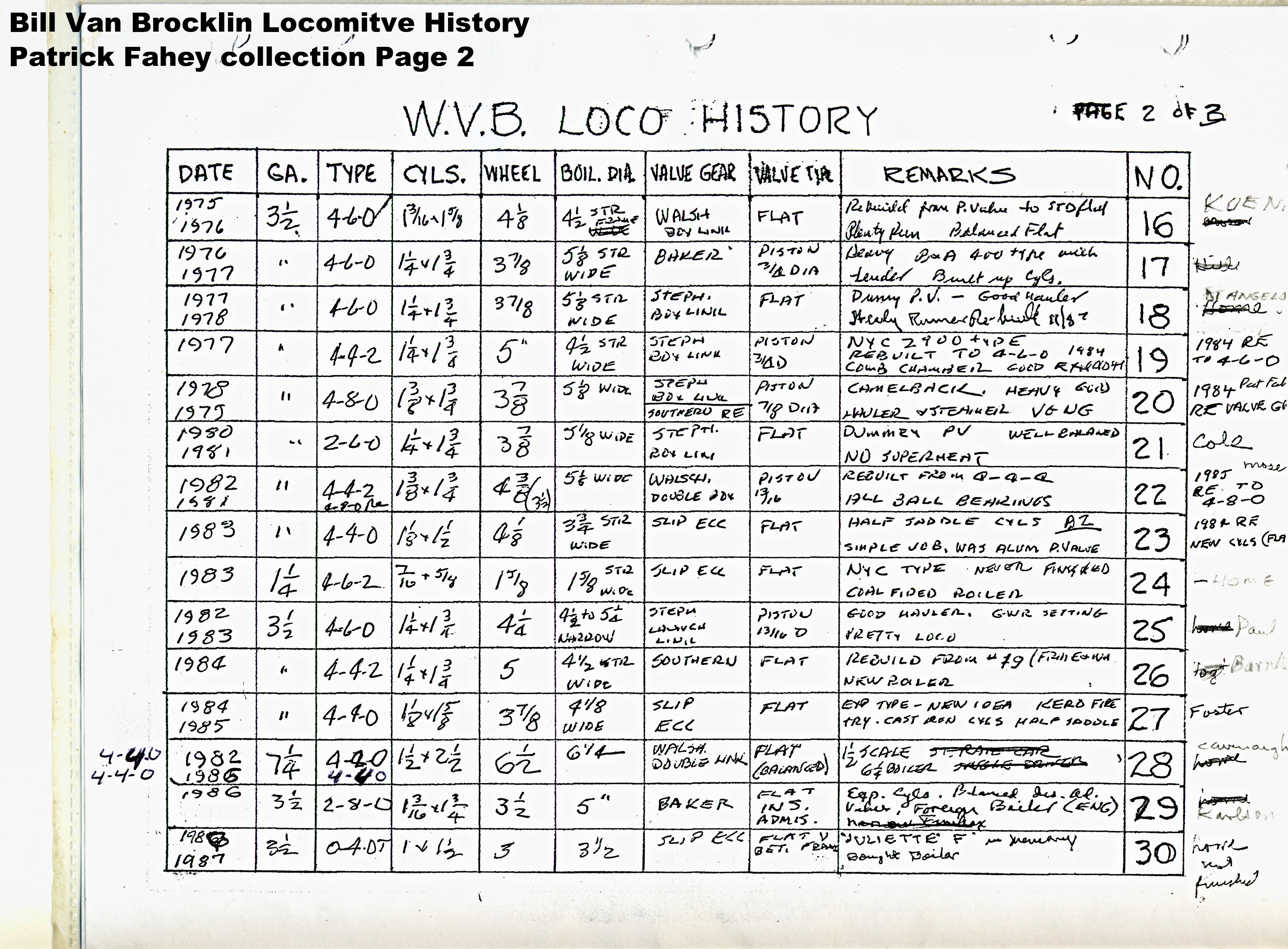 Bill Van Brocklin's locomotive history, page 2, from the Patrick Fahey collection.