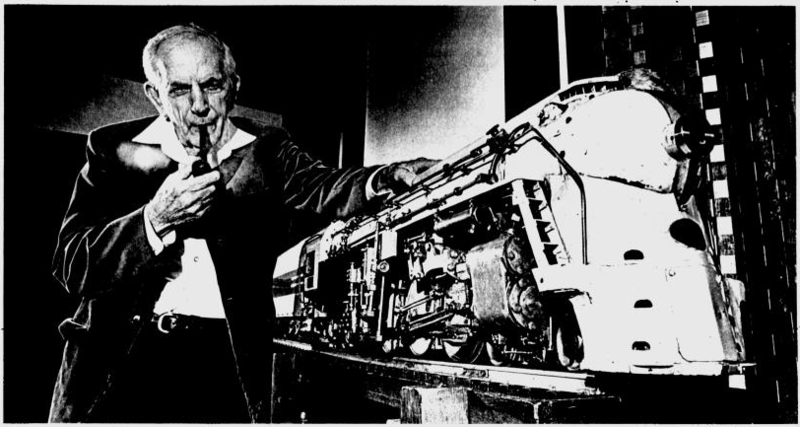 Clarkson Bundick poses with the NYC Hudson he built. Photo by John Paraskevas, "The Free Lance-Star", 1977.