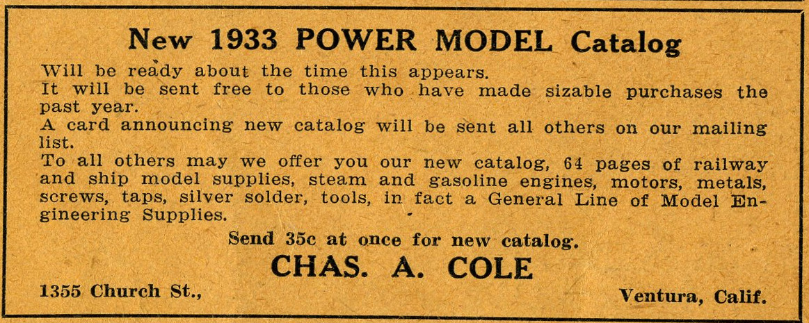 Coles Power Models advertisement for their 1933 Catalog in "The Modelmaker", September 1932.