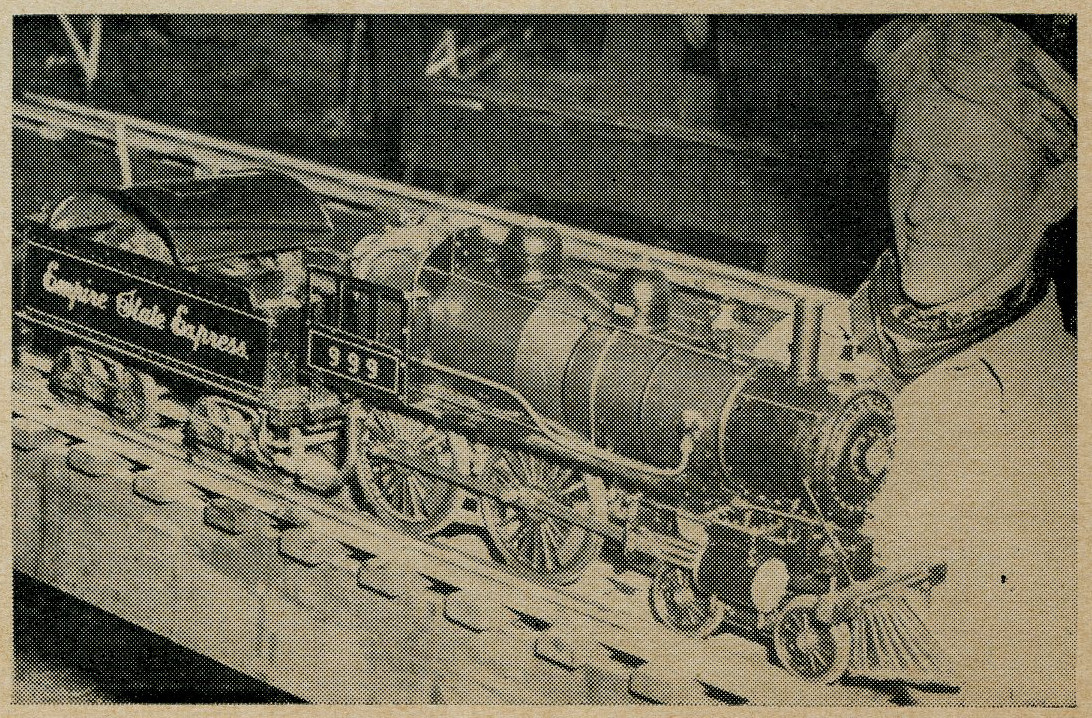 Ed Bergh with his 3-1/2 inch gauge 4-4-0 No. 999 taken at Danvers in October, 1953 by photographer A. W. Leggett. From "The Miniature Locomotive", Nov-Dec 1954