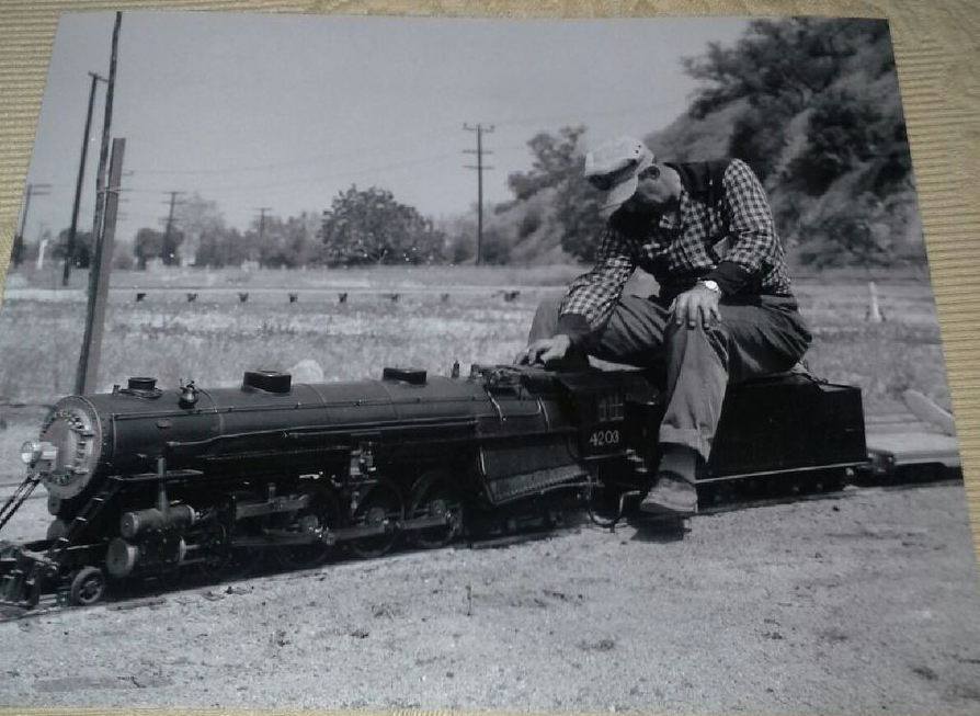 L.E. Smith driving 1 inch scale 4-8-4 Number 4203 at Griffith Park. Photo provided by Jordan Austin Karasek, great-grandson of L.E. Smith. Steve R wrote on Chaski.org, December 18, 2015: "That looks like LALS - the hill in the background would be the one at the east parking lot. And the little bridge would go over the drain, where there is currently a bridge. This picture would be near the Disney walkway, facing east."