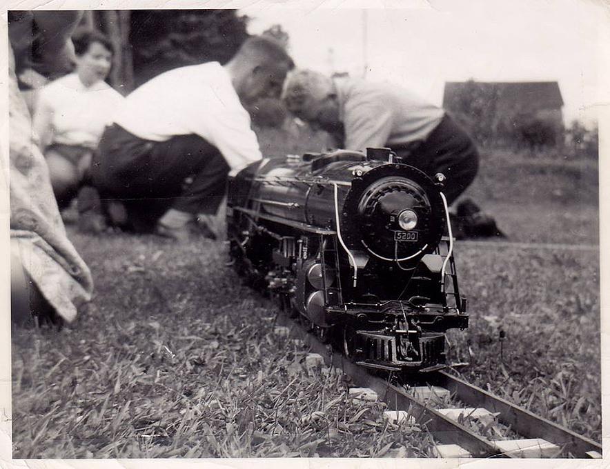 Norman Mottshaw's NYC Josslin 5200 in 3/4 inch scale. Note the Groovy Track using flat steel rails and slotted wood ties. Left to right: Helen Deachman, Jimmy Deachman, Norman Mottshaw. Photo provided by Pete Deachman. From http://petedeachman.wix.com/peter-deachman#!Grampa Norman's Train/zoom/cjg9/image1jn9