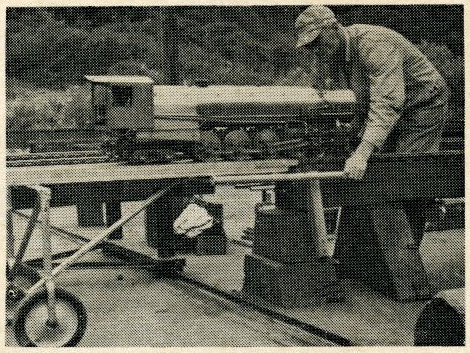 Showing how dolly lines up with track. The engine can now be rolled onto the main line. Photo by Harry Dixon, from "The Miniature Locomotive", May-June 1953