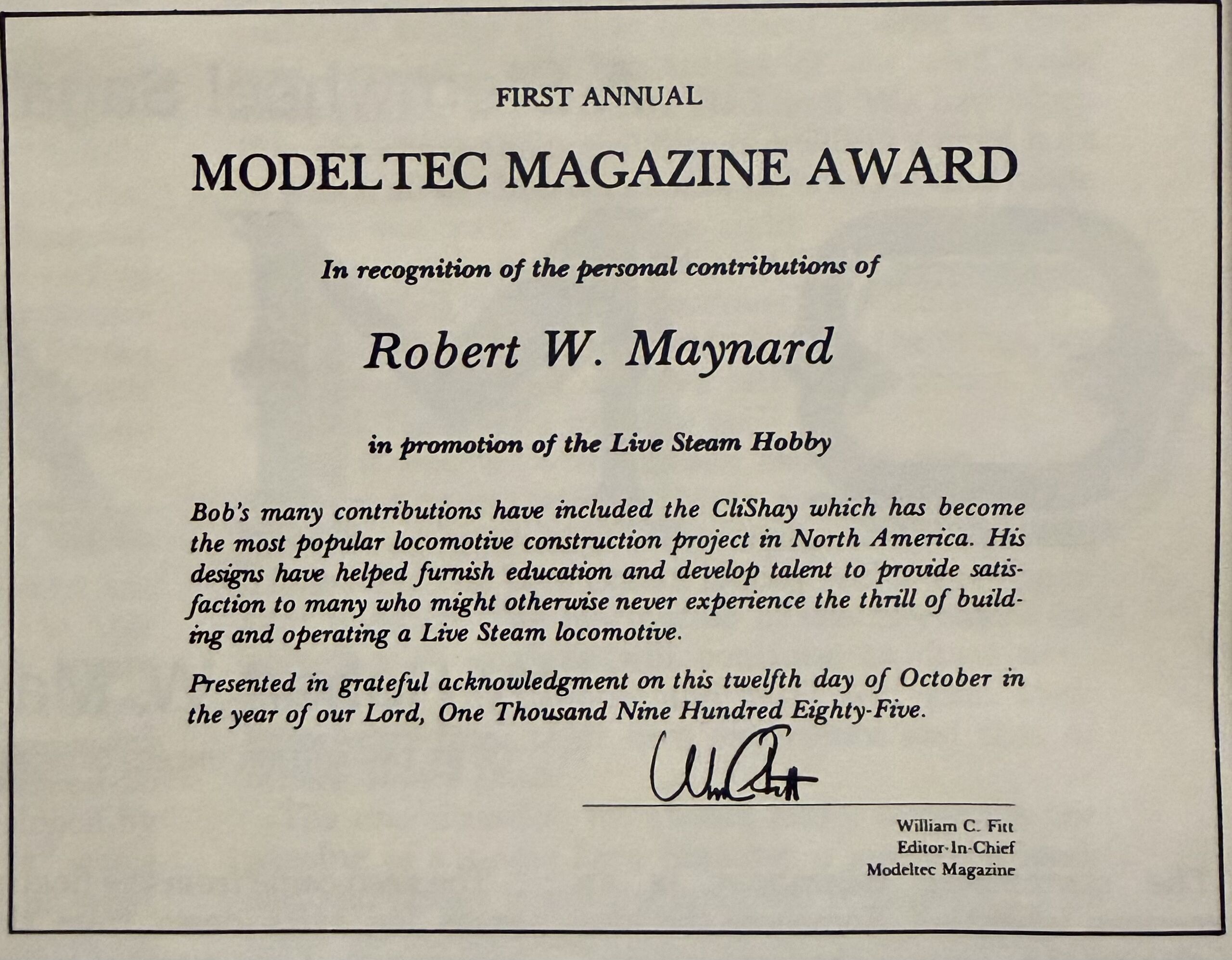 The Modeltec Magazine Award was presented to Robert W Maynard 12 October 1985. From Modeltec, November 1985.