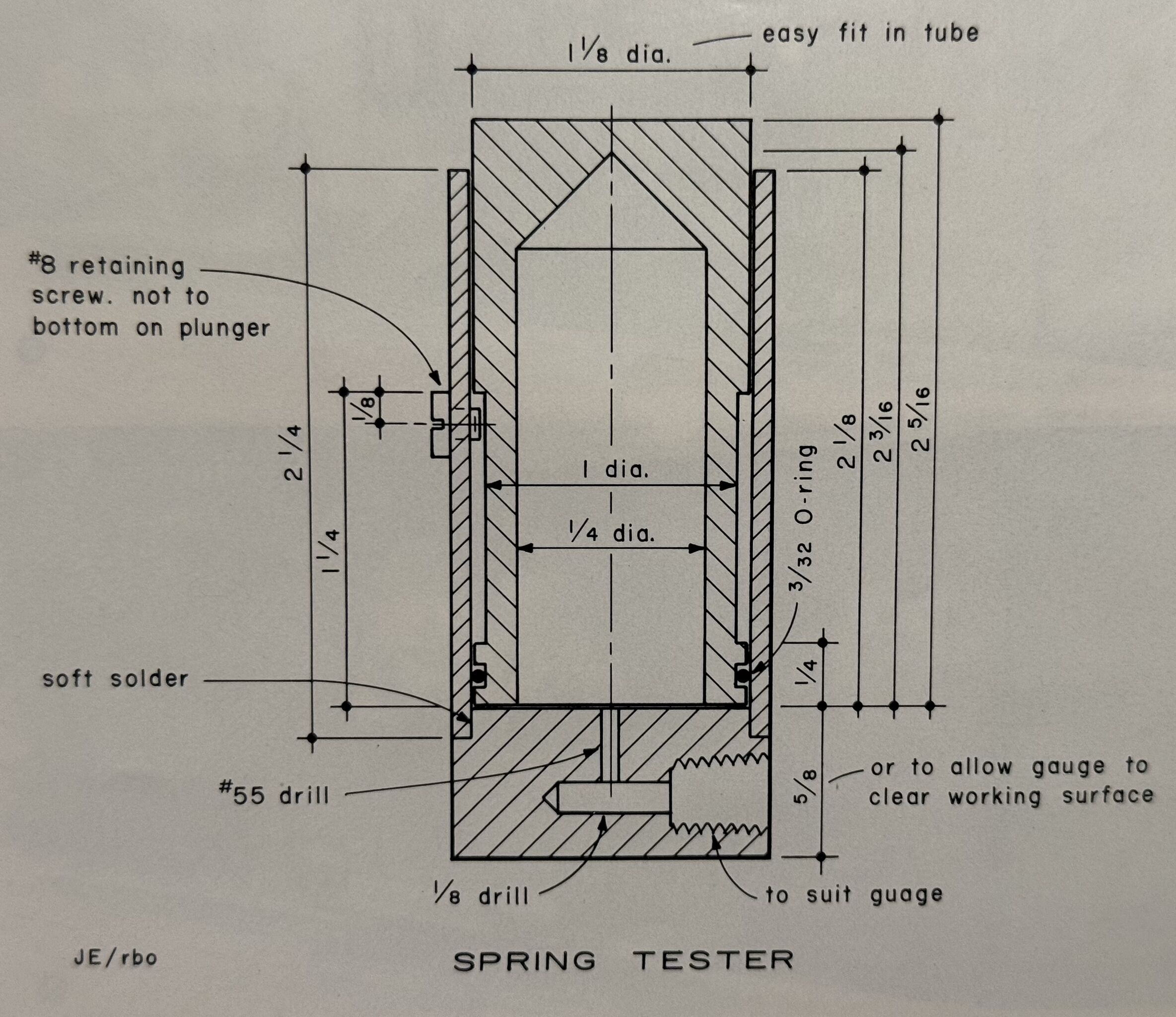 Drawing of Jack Edwards' Spring Tester, drafted by R. Bruce Owens of the Modeltec staff. Modeltec, December 1985