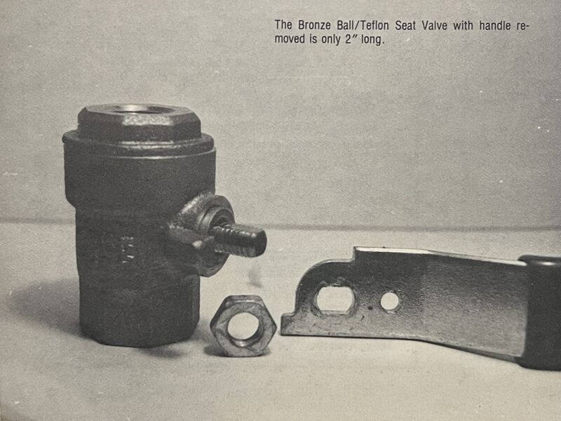 The Bronze Ball/Teflon Seat Valve with handle remove is only 2 inches long. Photo by Robert Maynard, Modeltec May 1984.