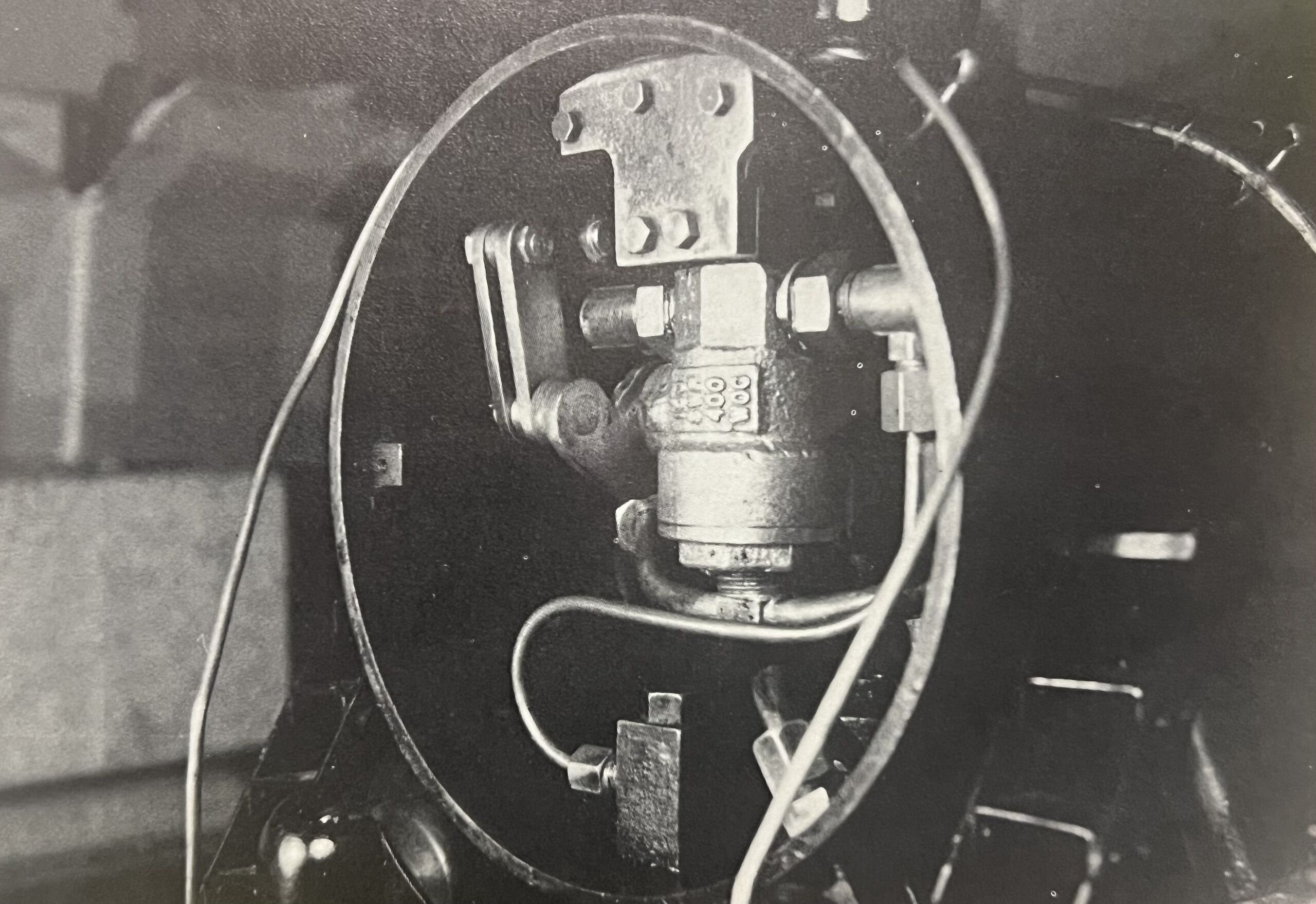 The throttle is shown three-quarters open. Attachment to the smokebox is by the use of a brass block, secured to the top of the throttle by 6-32 screws. The steel plate is attached to the mounting angle (riveted to the top of the smokebox) by the use of 5-40 screws. The mounting angle and location were part of the mounting to fasten the original throttle. Photo by Robert Maynard, Modeltec May 1984.