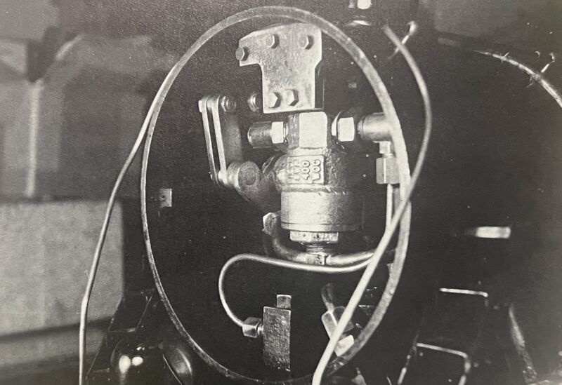 current | 08:48, 12 August 2025 | ![]() | 3,592 × 2,466 (1.57 MB) | Dnevil (talk | contribs) | The throttle is shown three-quarters open. Attachment to the smokebox is by the use of a brass block, secured to the top of the throttle by 6-32 screws. The steel plate is attached to the mounting angle (riveted to the top of the smokebox) by the use of 5-40 screws. The mounting angle and location were part of the mounting to fasten the original throttle. Photo by Robert Maynard, Modeltec May 1984. |