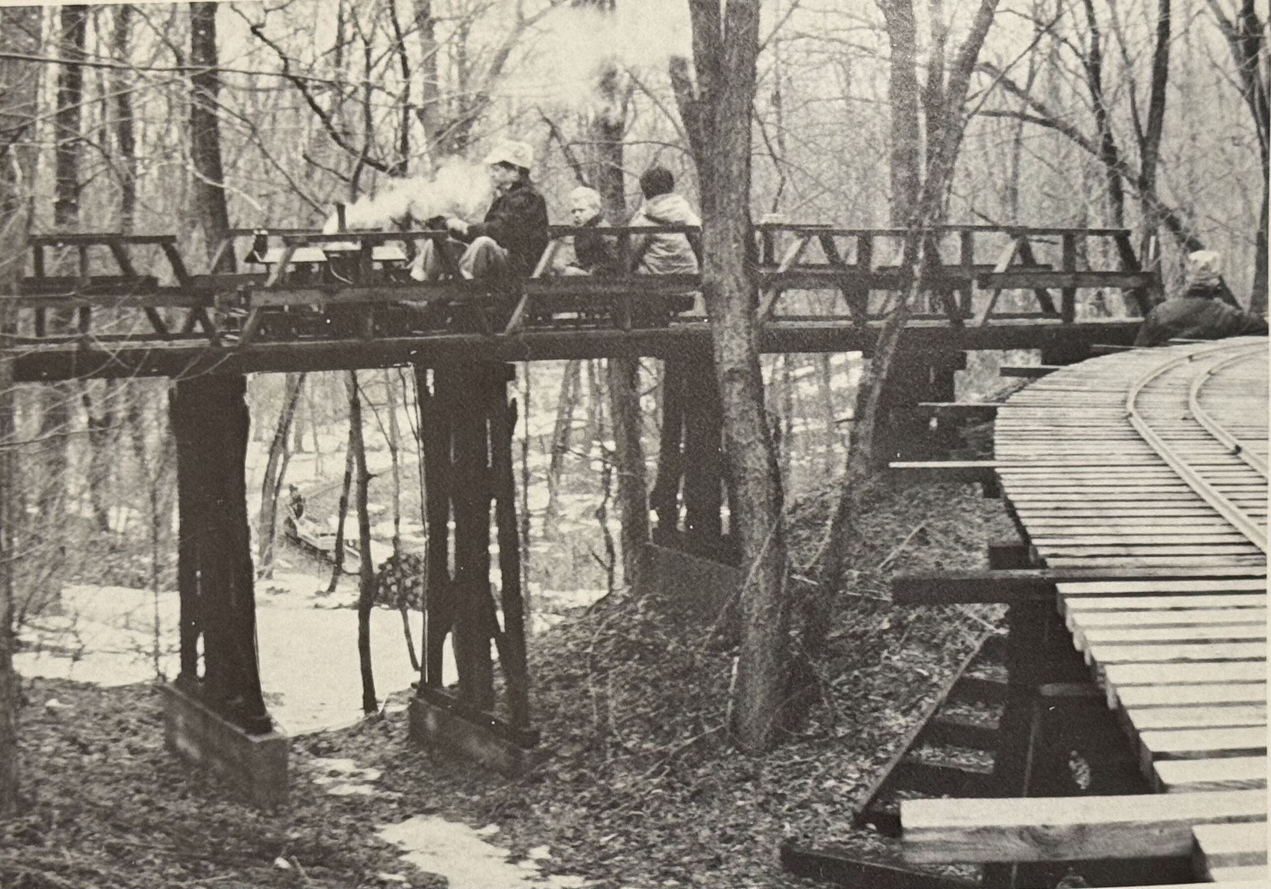 current15:54, 15 January 2026Thumbnail for version as of 15:54, 15 January 20263,589 × 2,511 (1.92 MB)Dnevil (talk | contribs)Tom Patton rolls his CliShay across Trestle #1 while Paul Fitt can be seen through the bents, rounding the curve at Wood Lot Siding...twenty feet below. From Modeltec, June 1984.