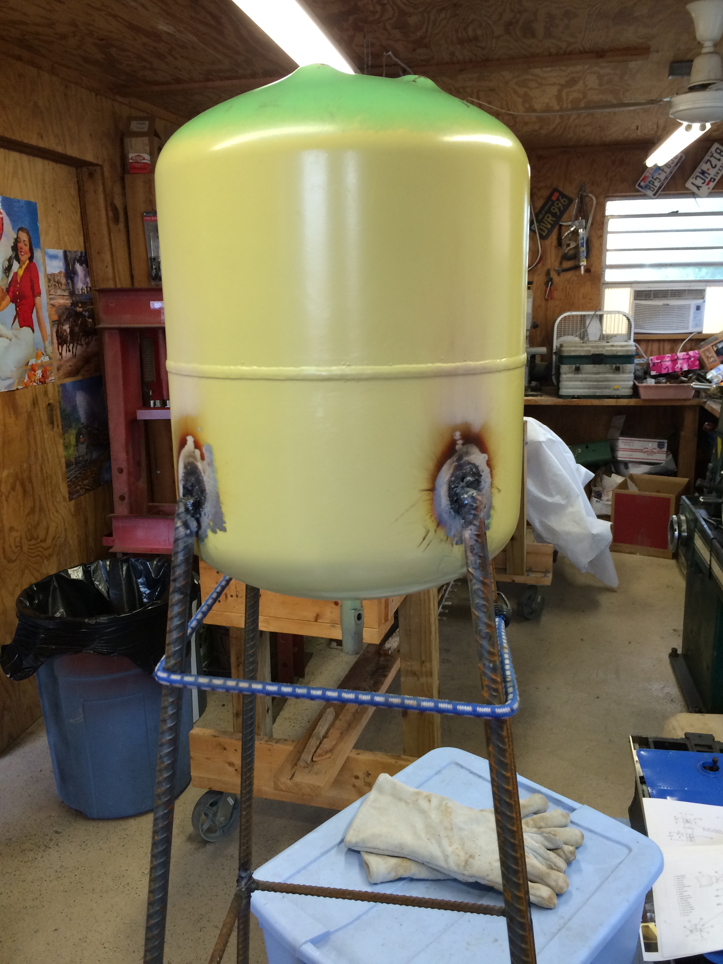 Remove the handle and valve from the top of the freon tank. Sand down to the bare metal where the struts will be welded. The tank wall is thin so use a low power setting (40 amps) and a small diameter stick (1/16 inch). Or, use a wire MIG welder. Photo by Daris A Nevil, March 2015.