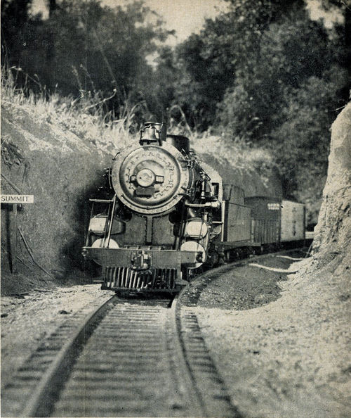 At present I have about 920 feet of track. This includes a small oval within a big one with about 70 feet of tangent. There is a 90 foot spur which runs into the garage under my workbench. This is a temporary roundhouse. We load our passengers on the small loop and round the sharpest curve (30 foot radius) to get on the main loop. Shortly after we hit the main line we cross a 6 foot steel channel bridge. From there we curve in under a tunnel of live oaks on a five foot fill and start up the longest grade. This grade hits a maximum of 3% and is about 120 feet long. About half way up the grade we start into a cut which reaches a depth of around 4 feet at the summit. Here one of my hopes was fulfilled, for with a good load behind her the "515" really blasts her way up this canyon. The cut, which is S shaped ends about 70 feet later at the start of the 25 foot redwood trestle. The track follows along the side of a gentle slope for some distance at this point. From here you look out across La Canada Valley up to Mt. Wilson. It is quite a spectacular view, especially in the winter when the mountains are covered with snow. Then comes about 25 feet of 4-1/2% grade across the driveway. This is the steepest climb, but it quickly tapers off and drops back down on an easy S curve to the small loop switch. | At present I have about 920 feet of track. This includes a small oval within a big one with about 70 feet of tangent. There is a 90 foot spur which runs into the garage under my workbench. This is a temporary roundhouse. We load our passengers on the small loop and round the sharpest curve (30 foot radius) to get on the main loop. Shortly after we hit the main line we cross a 6 foot steel channel bridge. From there we curve in under a tunnel of live oaks on a five foot fill and start up the longest grade. This grade hits a maximum of 3% and is about 120 feet long. About half way up the grade we start into a cut which reaches a depth of around 4 feet at the summit. Here one of my hopes was fulfilled, for with a good load behind her the "515" really blasts her way up this canyon. The cut, which is S shaped ends about 70 feet later at the start of the 25 foot redwood trestle. The track follows along the side of a gentle slope for some distance at this point. From here you look out across La Canada Valley up to Mt. Wilson. It is quite a spectacular view, especially in the winter when the mountains are covered with snow. Then comes about 25 feet of 4-1/2% grade across the driveway. This is the steepest climb, but it quickly tapers off and drops back down on an easy S curve to the small loop switch. | ||
