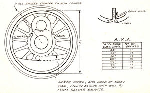 Step 6. Lay out positions of spokes on the rim, and at point on hub where spokes if drawn to center of hub would intersect center. Carefully measure each spoke and after all fit in correct position - glue. Exact fit is not essential as you can fill in later with wax. The wax paper prevents glueing the apttern to the table and will come off easily when dry.