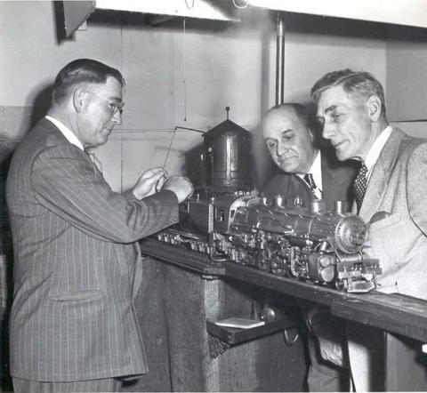 E.D. Moody, General Manager of the Southern Pacific, fills a tender water tank as Victor Shattock and a friend look on.