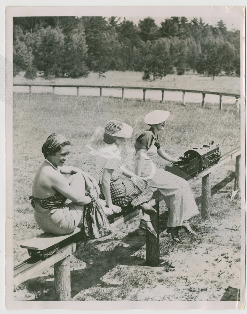 Preparing for Miniature Locomotive Meet Out for a trail run preparatory to being entered in the Live Steamers Annual Model Meet to be held at Oxford, Maine, June 7, is this model which was built by Eugene H. Stevens, of the Maine Highway Police. It is valued at $2,500, took 1,300 hours to build, and will haul a load of 1,900 pounds. it burns ordinary soft coal and is an exact model in every way of a real locomotive. Eleanor, Wheelright, of Wilton, Gerry Mann, of West Paris, and Irmalea Fehou, of Lewiston are enjoying the tour around the quarter-mile track where the meet will be held with 30 entrants from various sections of the country. 28 May 1936
