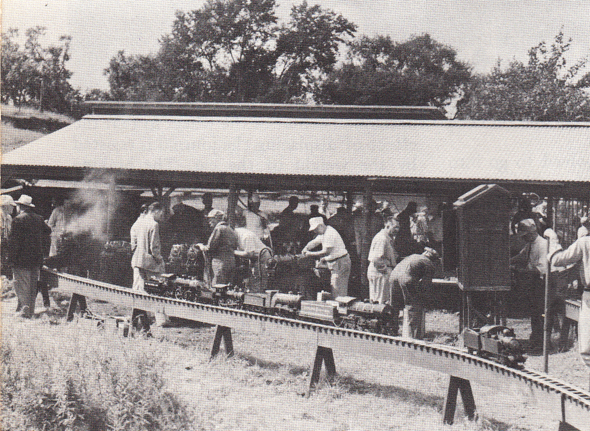 The steaming bays are busy at the BLS Meet hosted by the Pennsylvania Live Steamers, August 1952. Photo by Adrian Buyse. From Live Steam Magazine, June 1972.