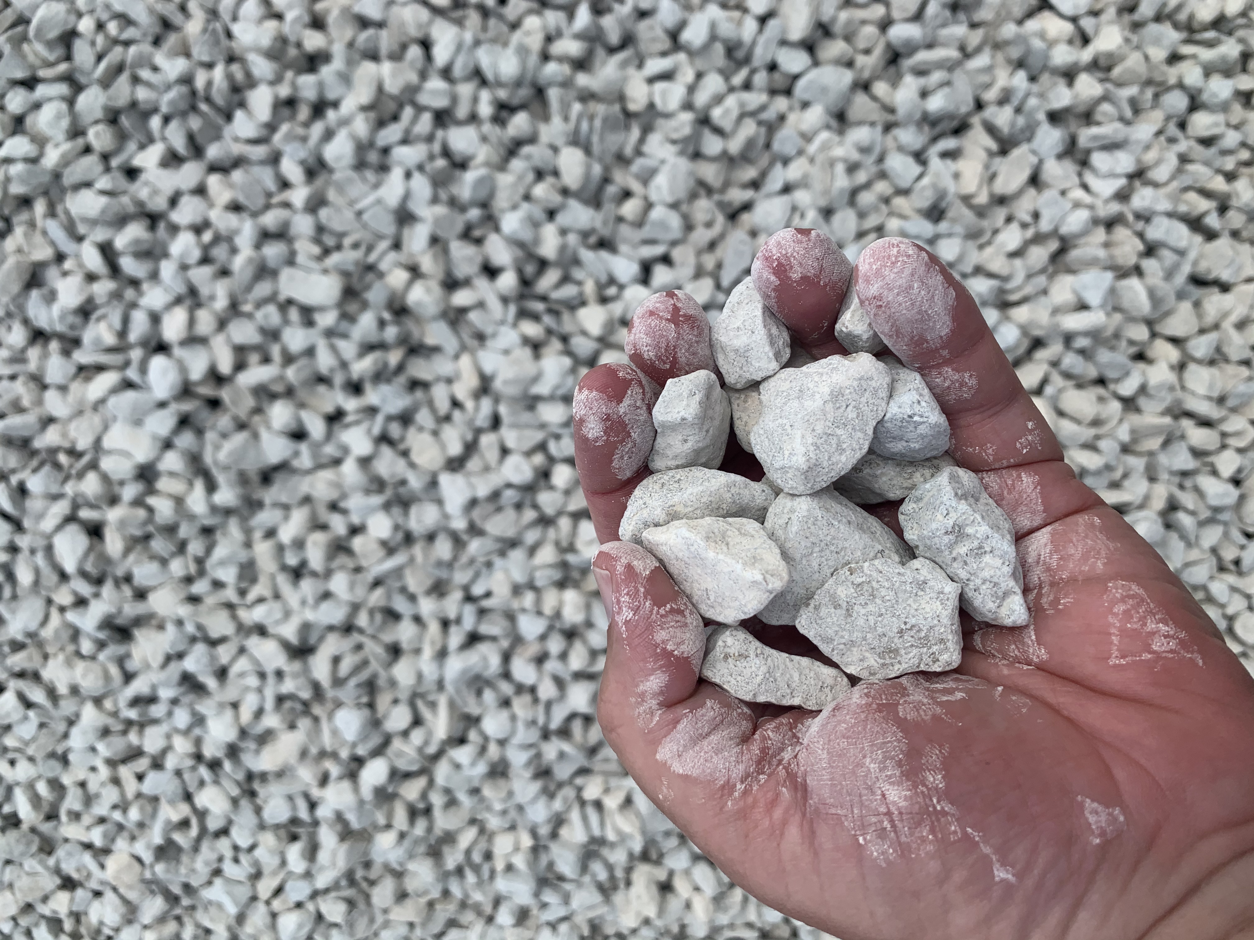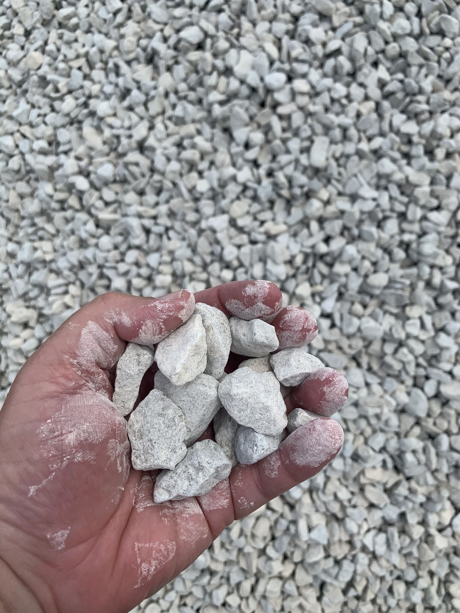 Crushed limestone, 3/4 to 5/8 inch, ready for application as ballast for 1.5 inch scale railroad. Photo by Daris A Nevil, July 2020.
