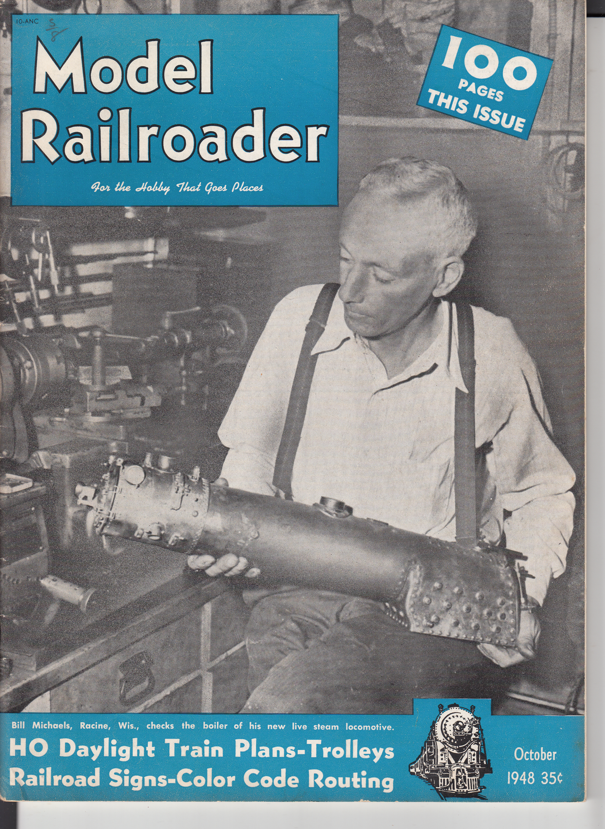 Bill Michaels inspects a live steam boiler. Cover page of Model Railroader magazine, October 1948. Photo possibly by C.P. Fox.