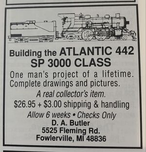 Revision as of 14:00, 25 January 2021 by Dnevil(talk | contribs)(Created page with "Category:PeopleD.A. Butler wrote the book "Building the Atlantic 4-4-2 SP 3000 Class". File:DA Butler SP3000 Book Advert LiveSteam 1991May.jpg|thumb|center|300px|...")