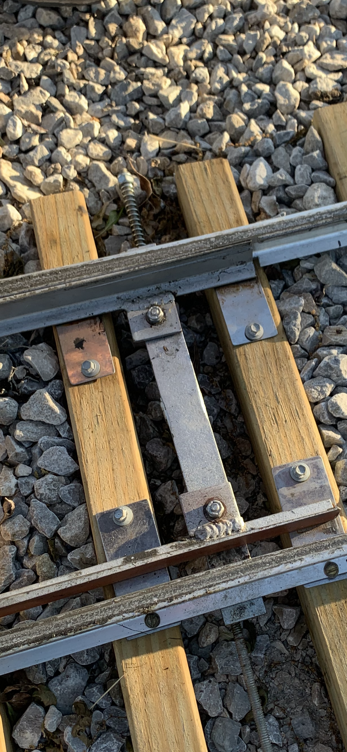 A turnout in the Indian Gap yard of the Comanche & Indian Gap Railroad. The turnout was constructed by Ken Smith. Photo by Daris A Nevil, April 2021.