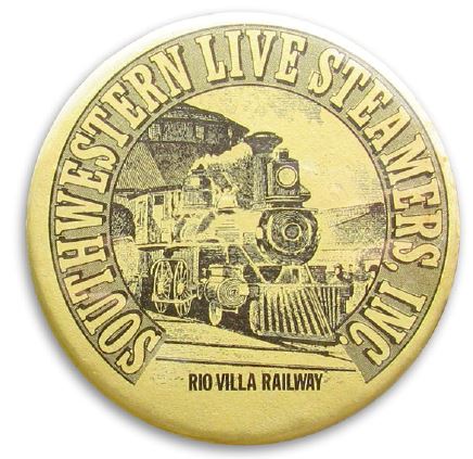 Commemorative button for a meet of the Southwestern Live Steamers at Cliff Pettis' Rio Villa Railway. Photo by Rose Pettis.