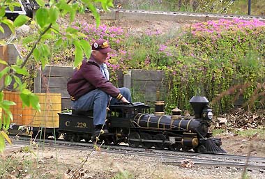Charlie Dockstader running his Central Pacific 229 at Bitter Creek in 2006. From https://www.jf2.com/bcwrr/Dockstader-Valve-Gear.html