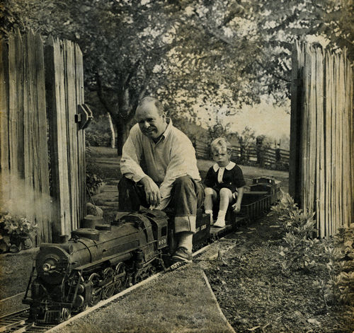 Pictured here is the man we have to thank for our "The Miniature Locomotive" magazine, Bob Day. The serious, yet happy looking brakeman, riding on the car next to the engine is his son Teddy. This photo was taken along the right of way of the Santa Monica Coast Lines at Bob's home in Brentwood. Photo by Ed Carroll. From "The Miniture Locomotive", May-June 1953.