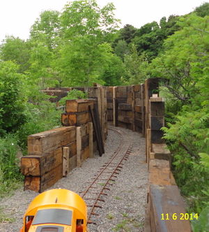 Here's a progress report on our new tunnel. So far we have 42 feet laid down with a 70 inch height on one side and 60 inch on the other side. These walls are built up with old RR bridge ties 10"x10"x6' and weigh in at 330 lbs each. So far I've hauled over 90 of these toothpics and last night we decided with the extra ties we could buildup another 6' making it 48' long ... and afterwards the roof.