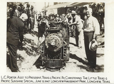 L. C. Porter, Assistant to the President of the Texas & Pacific Railway, christening The Little Texas & Pacific Sunshine Special, June 13, 1947, Longview Amusement Park, Longview, Texas.