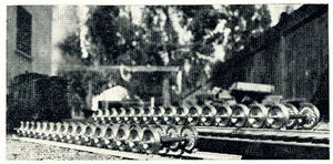 After the wheels are pressed on the axles you can finish turning the treads and flanges by the same method as described for the axles. The set-up is shown in the photo. When shaping the flanges, slight alteration can be made to correct spacing if needed.