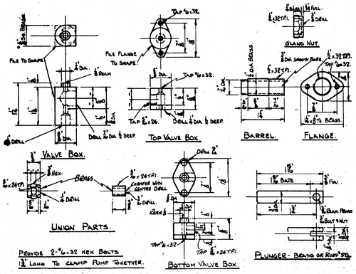 The union parts are easily made. CHuck 5/16 inch round. Run a 5/16-24 thread on for 1 inch, center deeply so the center drill forms the seating for the union cone, drill in for 1 inch with 3/16 inch drill and part off the first one at 3/8 inch long. Apply the center drill again and part off the second one. Now you've done enough lathe work for a little so a change to brazing is in order. Screw the oval flange onto the pump barrel to the thread's end. Run a little ring of flux around the back side of it and stand it on end (thread down), heat up to a medium red applying a little easy-flow wire to the joint. It will creep right around following the flux trail. Clean up the end of the barrel where it enters the valve box. Set it in place being sure the flange is level crossways. Anoint with flux and standing on end brazed up as before. Screw a union piece 1/8 inch into each valve box and run a braze around them. Now you can have a clean up time. While you are at it file the back off the pump body as it is rounded for appearance.
