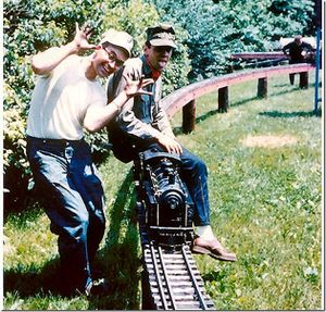 If you are injecting some humor into the hobby, here is a photo for you. It was June of 1969. Dick Symmes and I took our 3-1/2” gauge locos to the New Jersey Live Steamers spring meet. Apparently, someone stopped us and asked for a photo. Here it is. Dick is on his locomotive with his tongue out and I am acting silly. To this day, I don’t know who took the photo, nor can I remember why we stopped for the photo.