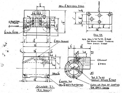 It will be as well to get the cylinder "holding on bolts" drilled and tapped so take a piece of flat bar about 2 inch wide and 5 inch long 1/4 inch or more thick. Set this on the frame flush with one side when it will stick over the other side 2 inches. Mark it up through the exhaust hole in the cross connection. Drill and bolt on with a 5/16 inch bolt. Now take the exhaust hold in the bolting face of the frame as center, scribe a vertical line 1-1/16 inch ahead and behind this center. You can now lay the engine on its back, the cylinder is now laid on the flat bar centered by the two lines which should just show at each end of the casting. Clamp to the flat bar and spot the three holding on bolt holes. Remove, drill and tap 1/4 inch by 20. Swing the flat bar to the other side and do the other cylinder the same. Bolt on one cylinder at a time with 1/4 inch by 5/8 inch Allen cap screws and spot the steam and exhaust holes. Remove, drill the exhaust to meet the milled port and the steam to come up in the corner of the valve chest. That is, you drill in 9/16 inch and drill down to meet it. She's beginning to look like an engine now.