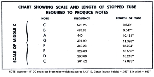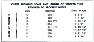 The chart gives you notes in the scale and their frequency along with the proper length of stopped pipe to create them. If the pipe length is doubled the same note will be derived, only one octave lower and vice-versa when the pipe is halved. An open pipe must be twice the length of a stopped pipe for the same note.