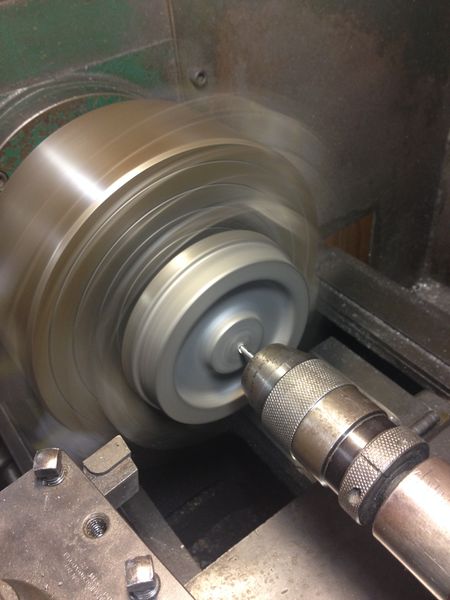 current23:08, 30 March 2014Thumbnail for version as of 23:08, 30 March 20142,448 × 3,264 (1.93 MB)Dnevil (talk | contribs)The wheel casting is mounted in the four jaw chuck. First operation is to center drill. Photo by Daris A. Nevil, 2014.