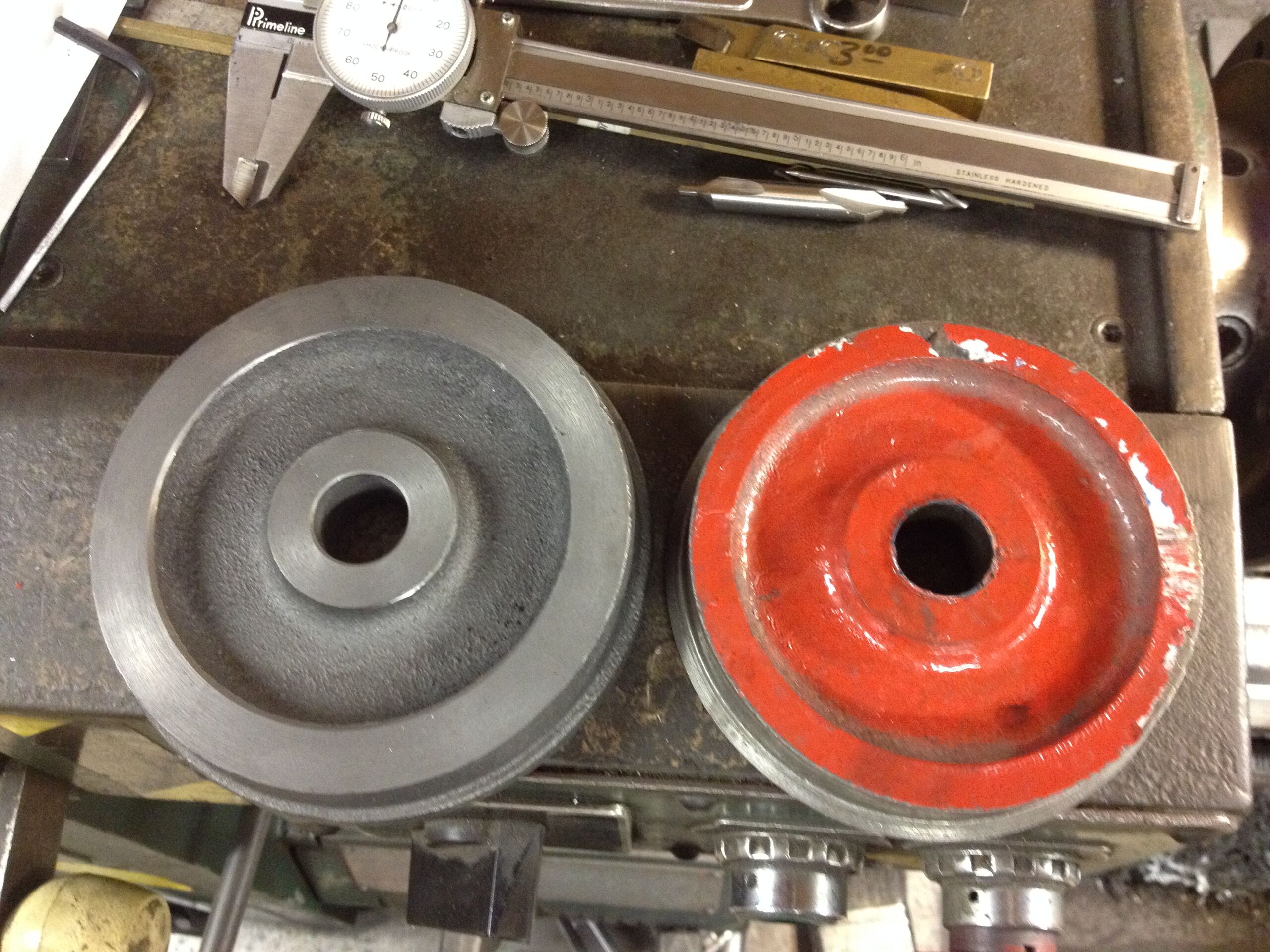 | current | 22:21, 30 March 2014 | 3,264 × 2,448 (2.87 MB) | Dnevil (talk | contribs) | Here is the bored and faced wheel compared to the worn wheel. I will press the new wheel onto the axle, then cut the tread. This will assure that the tread is cut concentric with the axle. Photo by Daris A. Nevil, 2014. |
