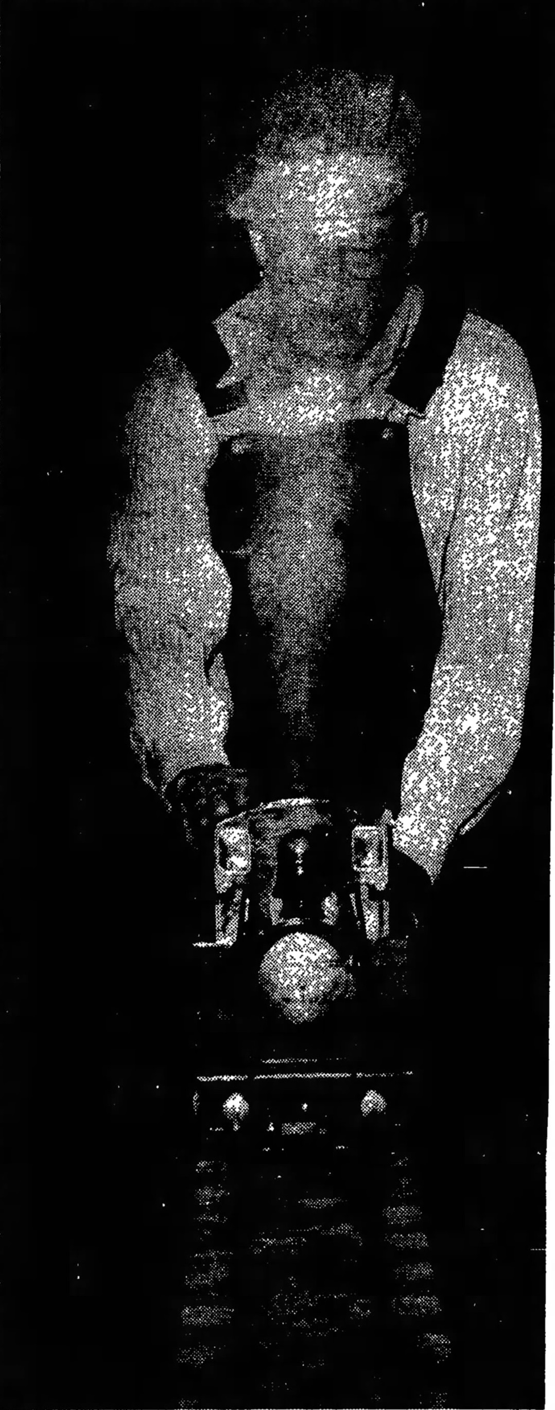 Steam Power - Al Barkdull of Shelby takes a ride behind his miniature steam engine on the track he built in his back yard. The engine can pull four adults seated on miniature cars. Mannsfield Ohio News Journal