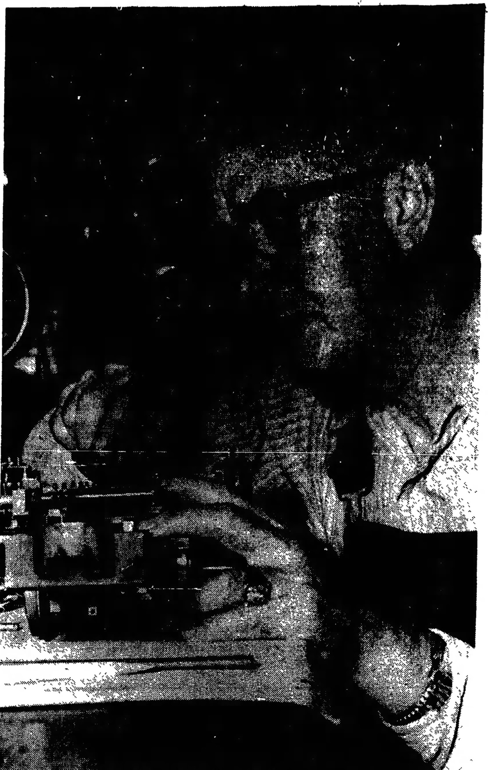 Hobbyist at work - Al Barkdull of Shelby, OH, works on the chassis of his second engine, a six-wheeled B&O switcher, in his basement workshop. He has been working on this engine off and on for 12 years. Mannsfield Ohio News Journal. Photo by Ron Simon.