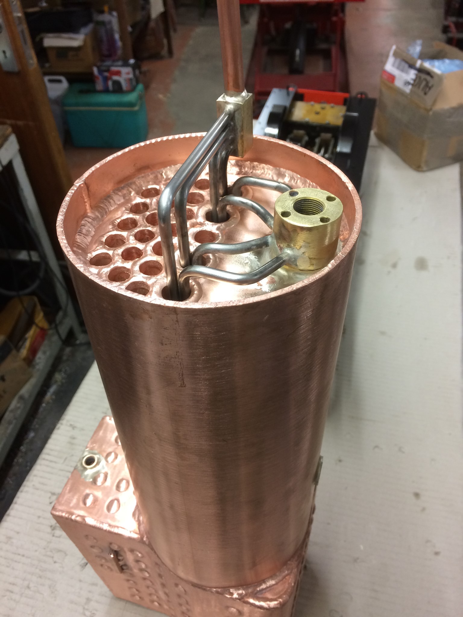 A beautiful tig-welded copper boiler by Andrew Probyn shows installation of superheater in flues. From Facebook, December 2019.