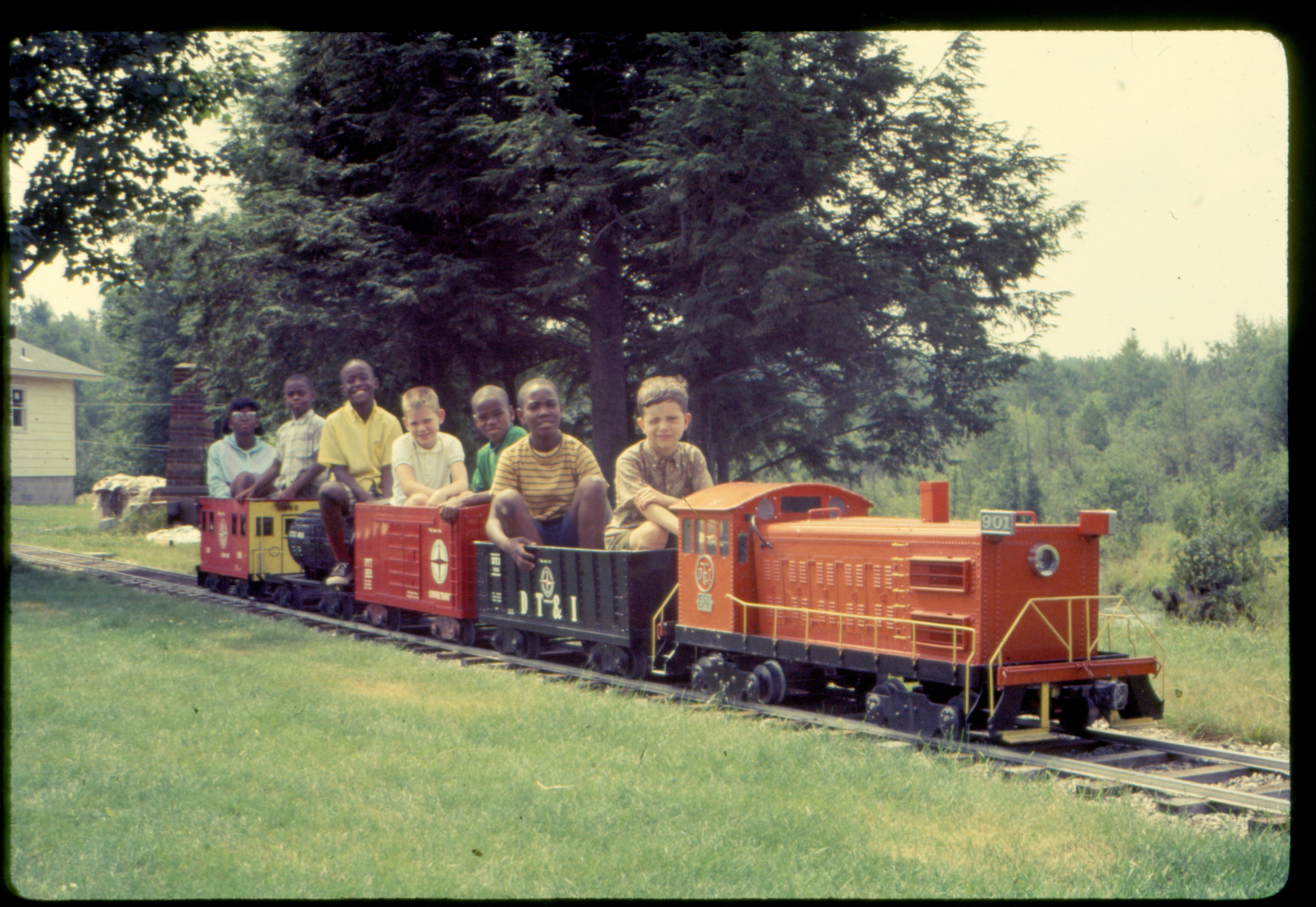 John D. Atkinson driving a train load of happy kids touring the Atkinson Railroad, 24 October 1968. From http://www.pbase.com/visual_first/image/148983065