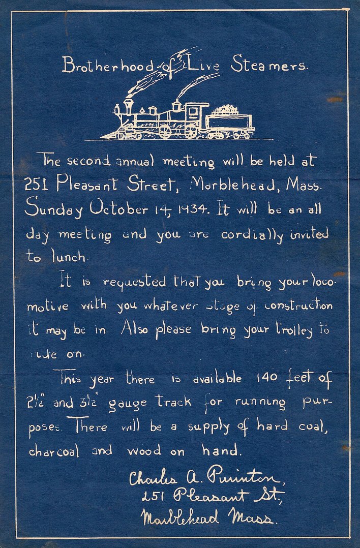This is an actual early invitation which Carl Purinton mailed to invited guests for the Brotherhood of Live Steamers which he formed in 1932. From http://www.northeastlivesteamers.org/Docs/History/NELSmem_boxford_2.html