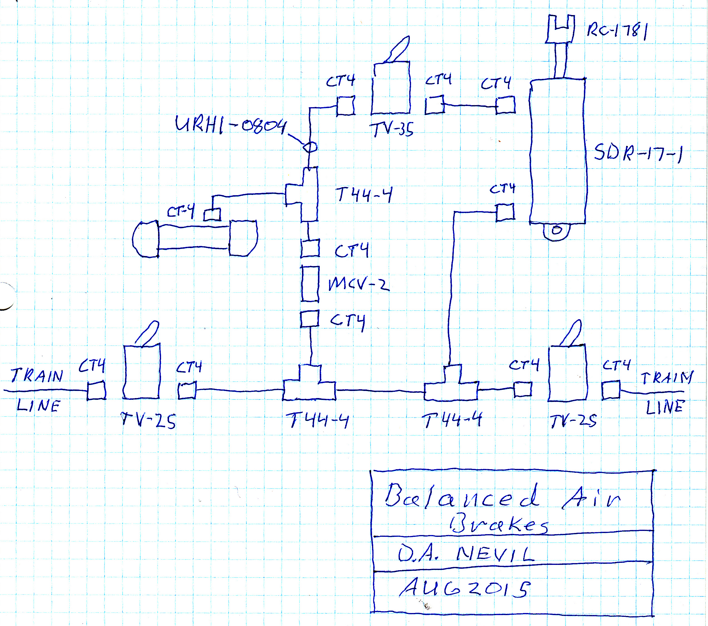 Schematic diagram for balanced air brakes. All part numbers are from the Clippard catalog. Drawn by Daris A Nevil, August 2015.