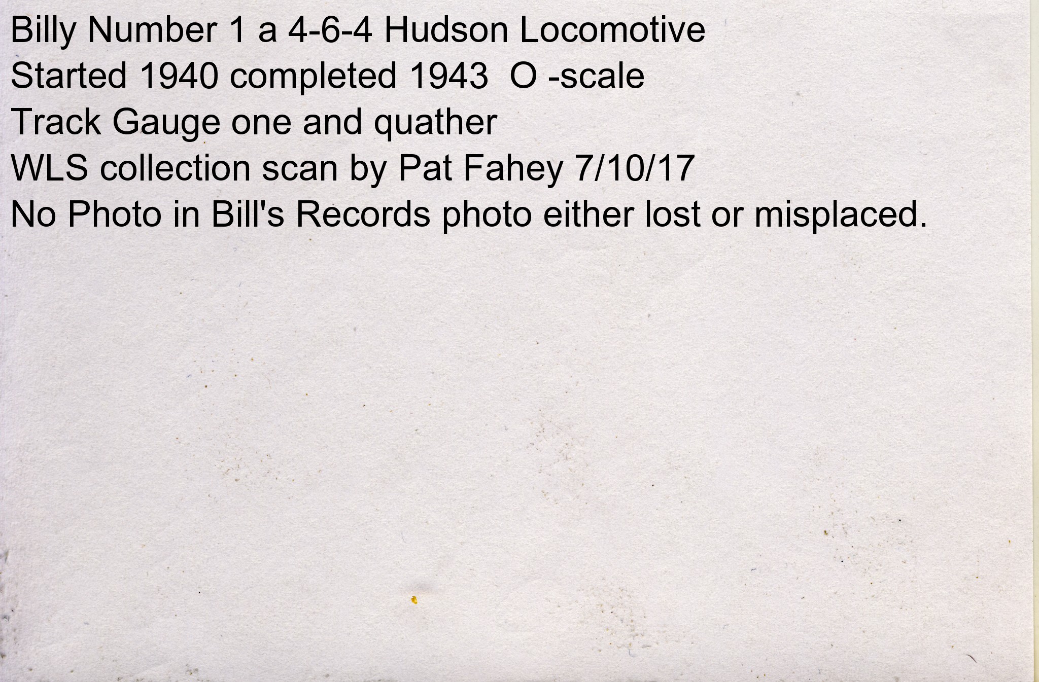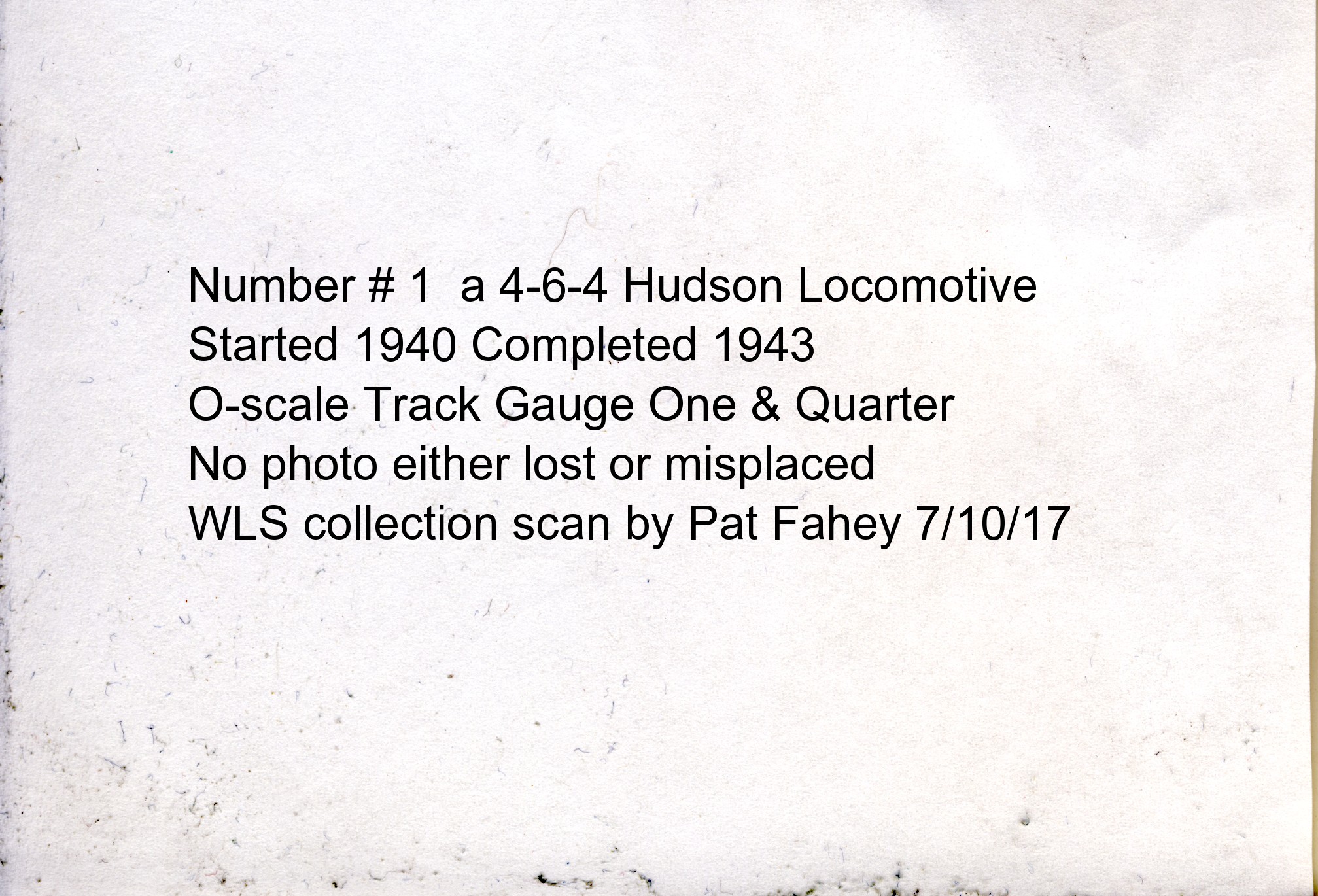 Bill Van Brocklin's No. 1 is a 4-6-4 Hudson in O-Scale, 1-1/4 inch gauge, started in 1940 and completed in 1943. This photo was recently discovered in a long-forgotten noteboook, August 2019, provided by Pat Fahey and Bob Newcombe.