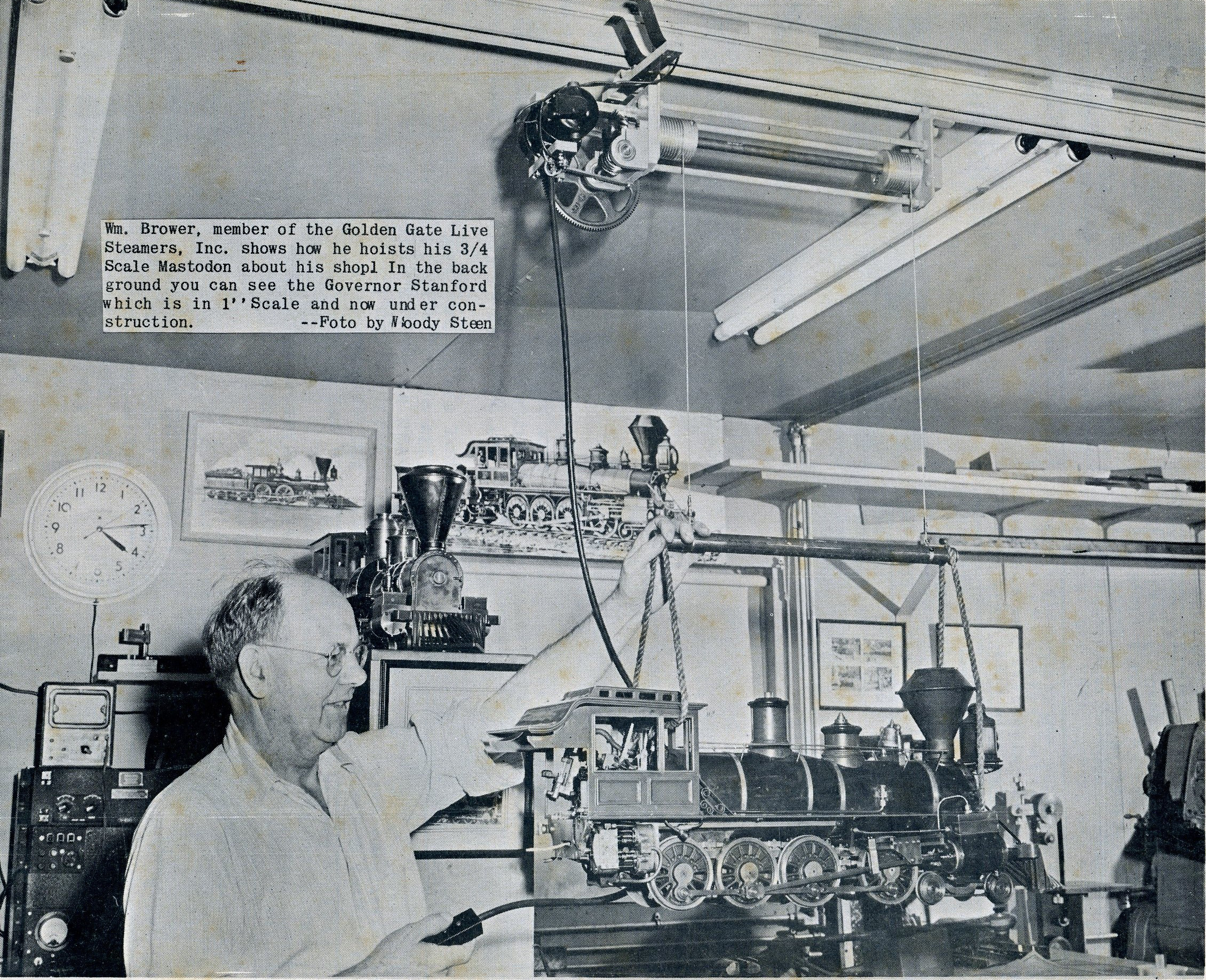William Brower, member of the Golden Gate Live Steamers, Inc. shows how he hoists his 3/4 inch scale Mastodon about his shop. In the background you can see the Governor Stanford which is in 1 inch scale and now under constructions. Photo by Woody Steen. From "The North American Live Steamer", Vol 1 No 5, 1956.