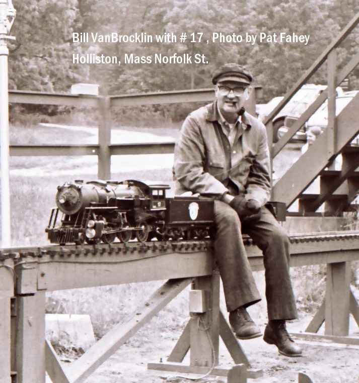 Bill Van Brocklin with his Locomotive No 17. Photo taken at the Norfolk Street track of the Waushakum Live Steamers, Holliston, Mass, by Pat Fahey.
