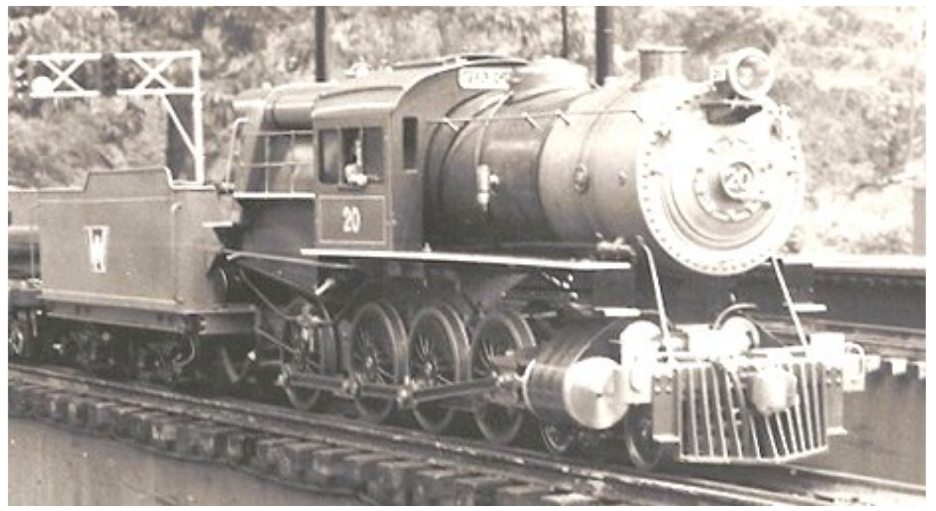 A 4-8-0 locomotive built by Van Brocklin, which is a departure from his other designs: Camelback, wheel arrangement, inclined cylinders.