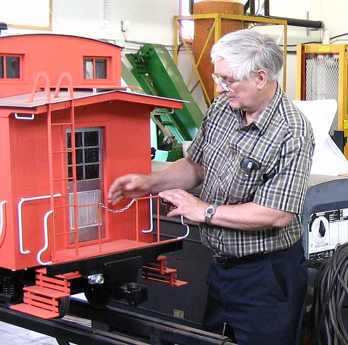 Bill Dykeman fitting a new aluminum door to his 2.5 inch scale caboose. From https://web.archive.org/web/20070206155520/http://www.precisionproducts.ca/YCR.html