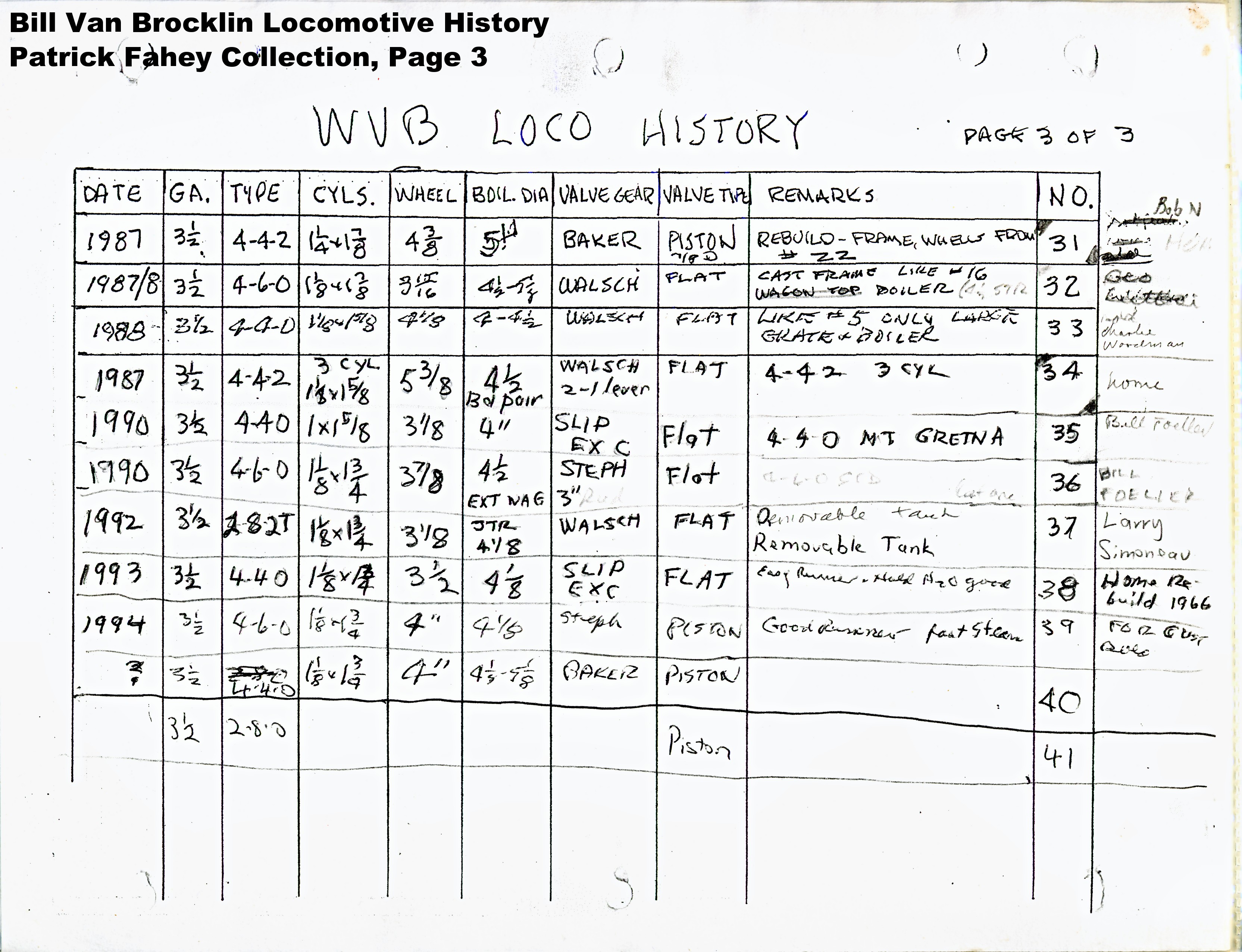 Bill Van Brocklin's locomotive history, page 3, from the Patrick Fahey collection.